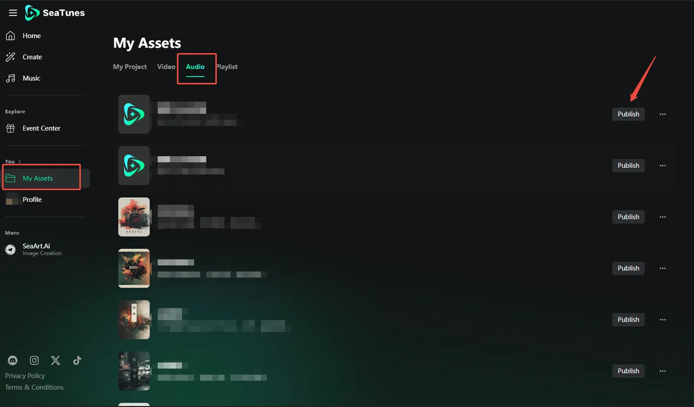 1️⃣ Create and publish your work with SeaTunes: After you finish creating, go to [My Assets] – [Audio] – [Publish] to publish your MV.